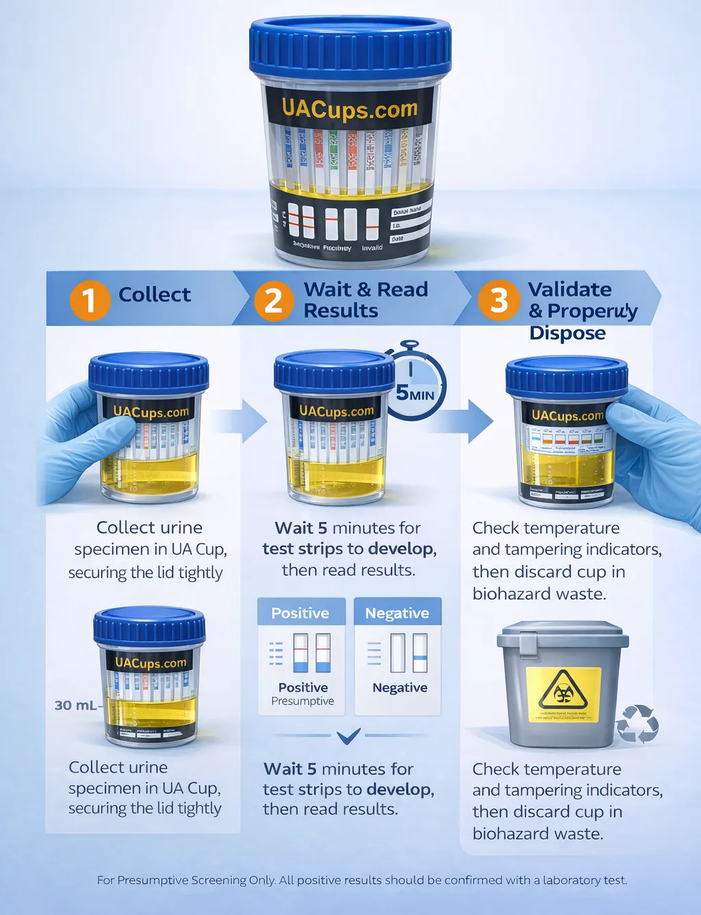 UA Cups are intended for screening purposes only. All presumptive positive results should be confirmed using laboratory-based confirmatory testing in accordance with applicable protocols or program requirements.